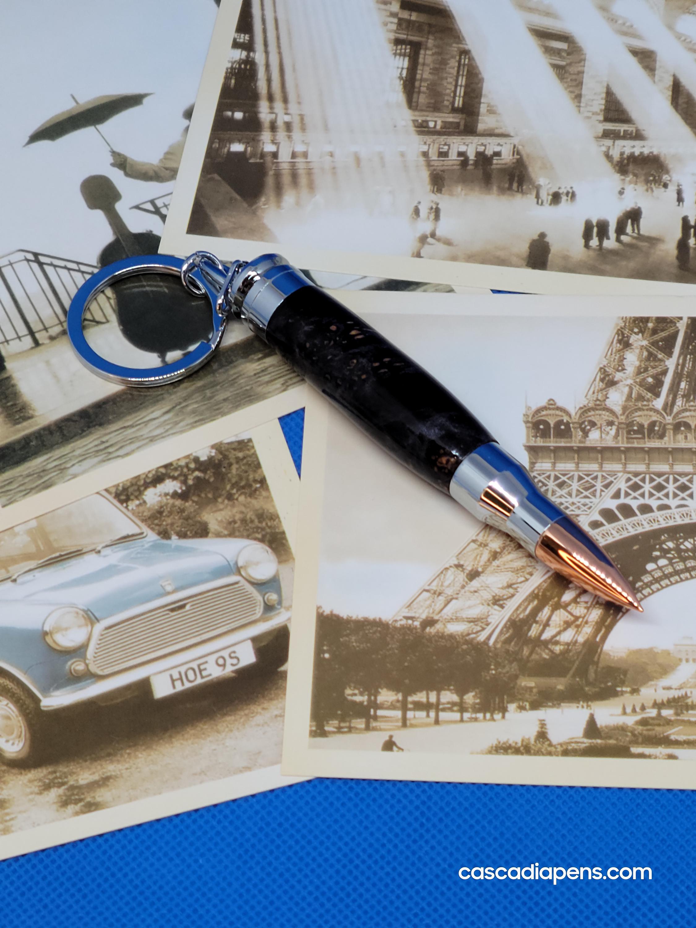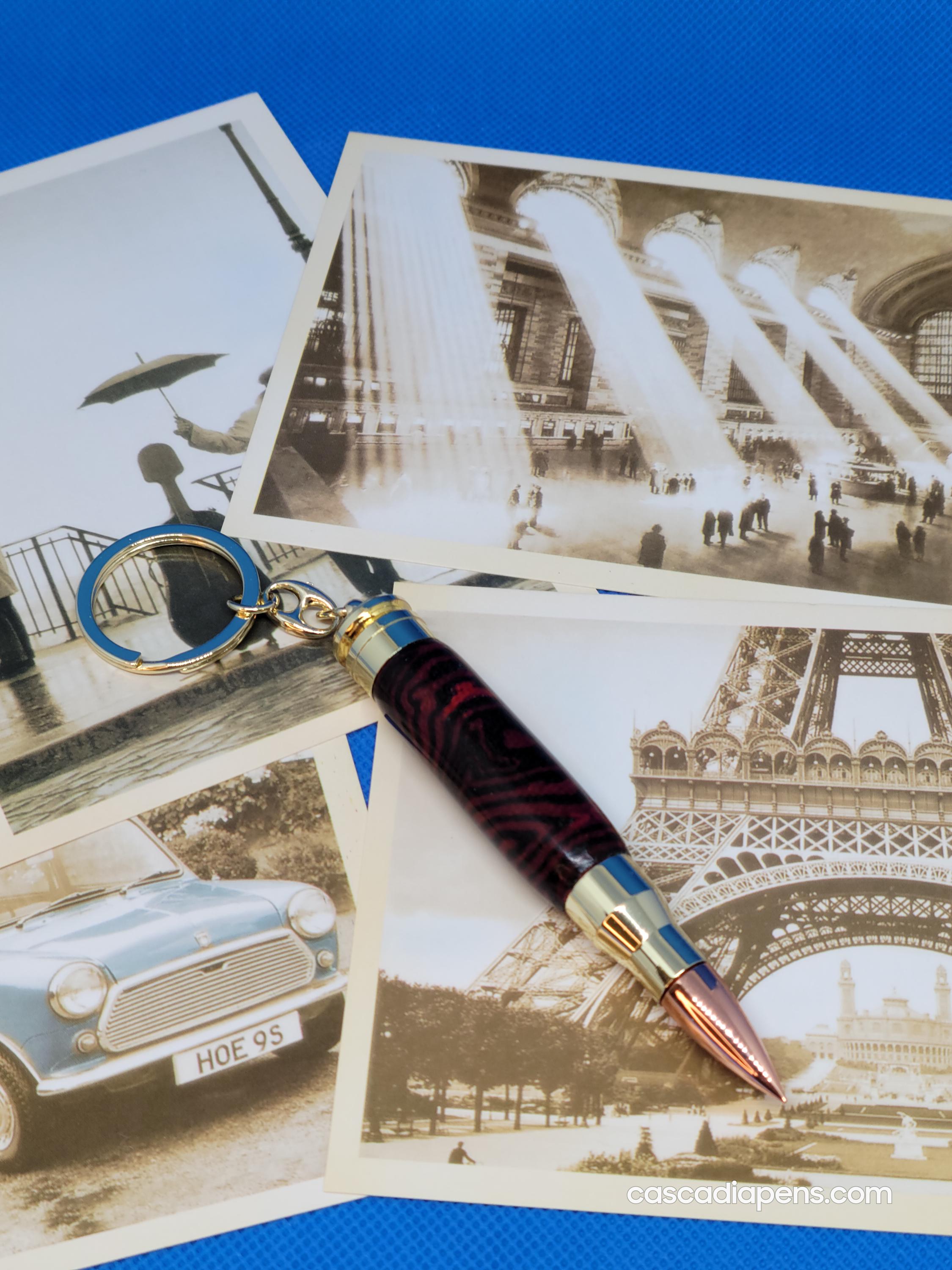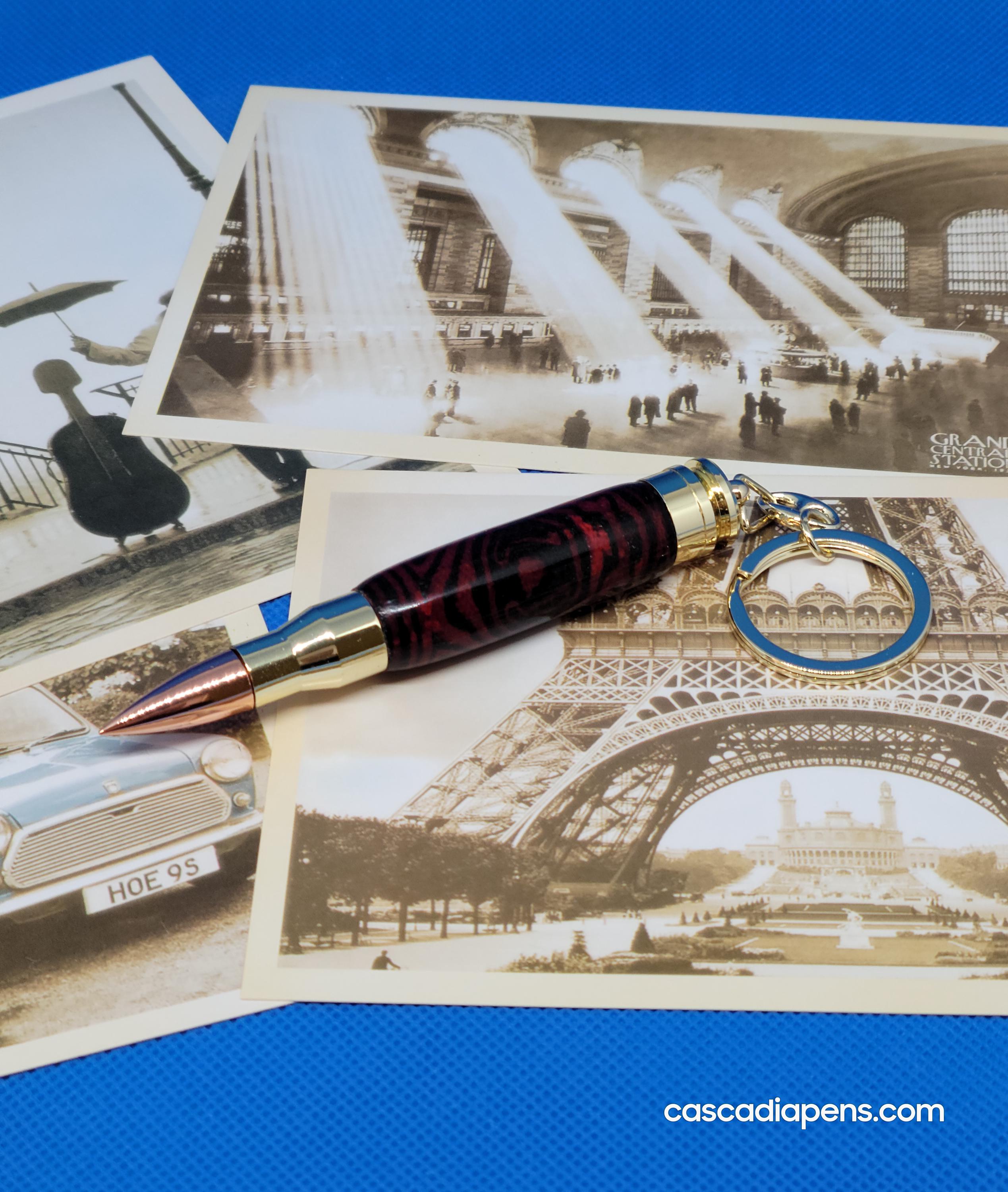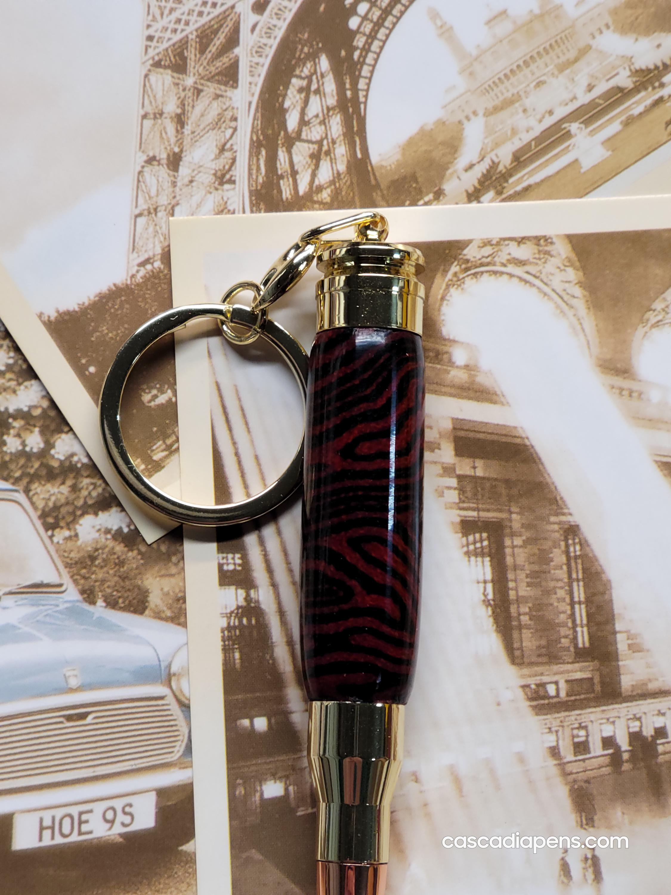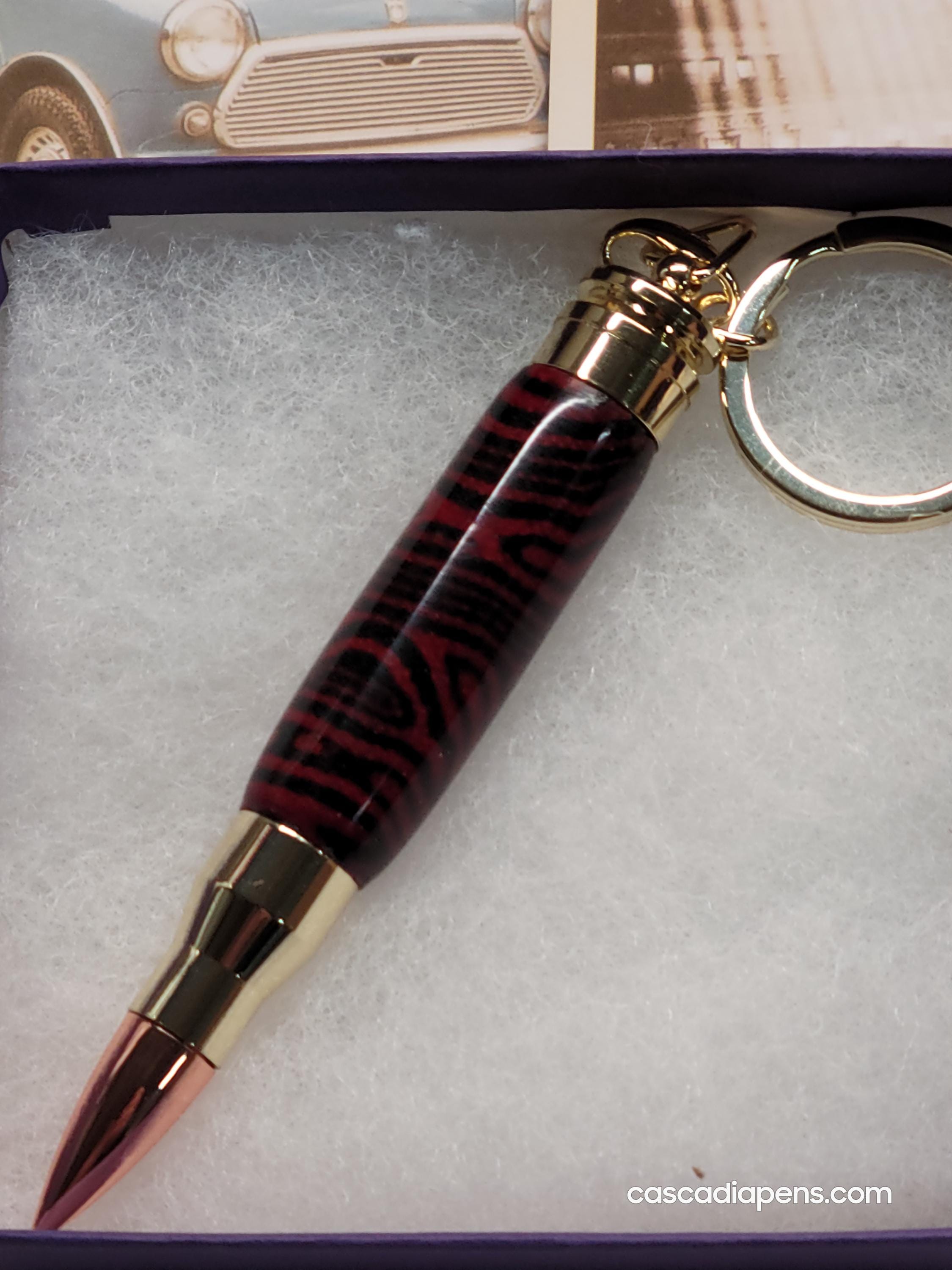 We are excited to offer the Bul let Key Ring, a fun and practical key ring that is accurately scaled. Gold-plated components and a copper-plated bullet tip give this key ring the genuine look and feel of a real 308 cal. The body is made of red and black micarta, a durable and attractive material that is infused with resin for added strength. This key ring is sure to be a hit with anyone who appreciates functional and stylish products. Gift box include.