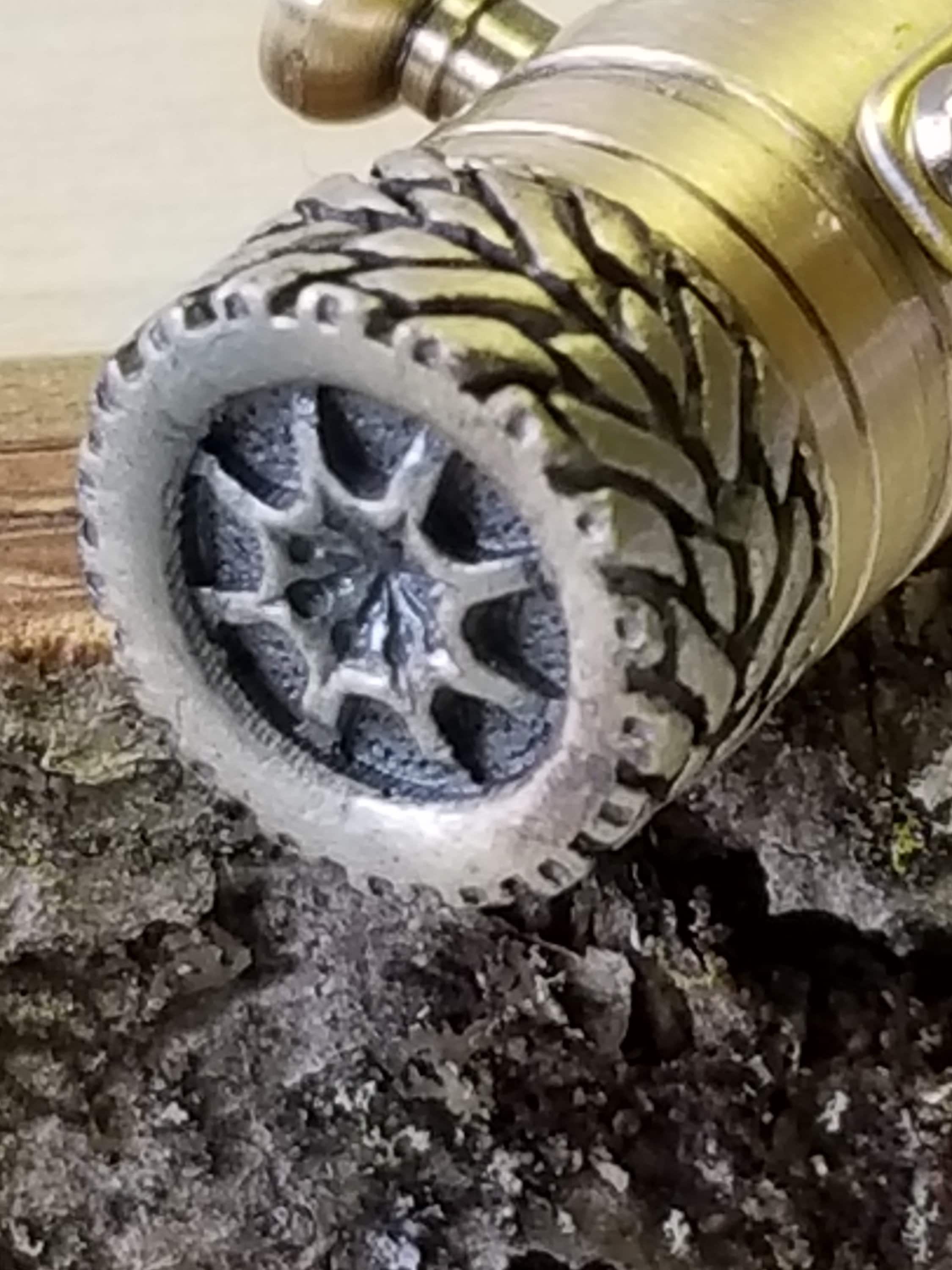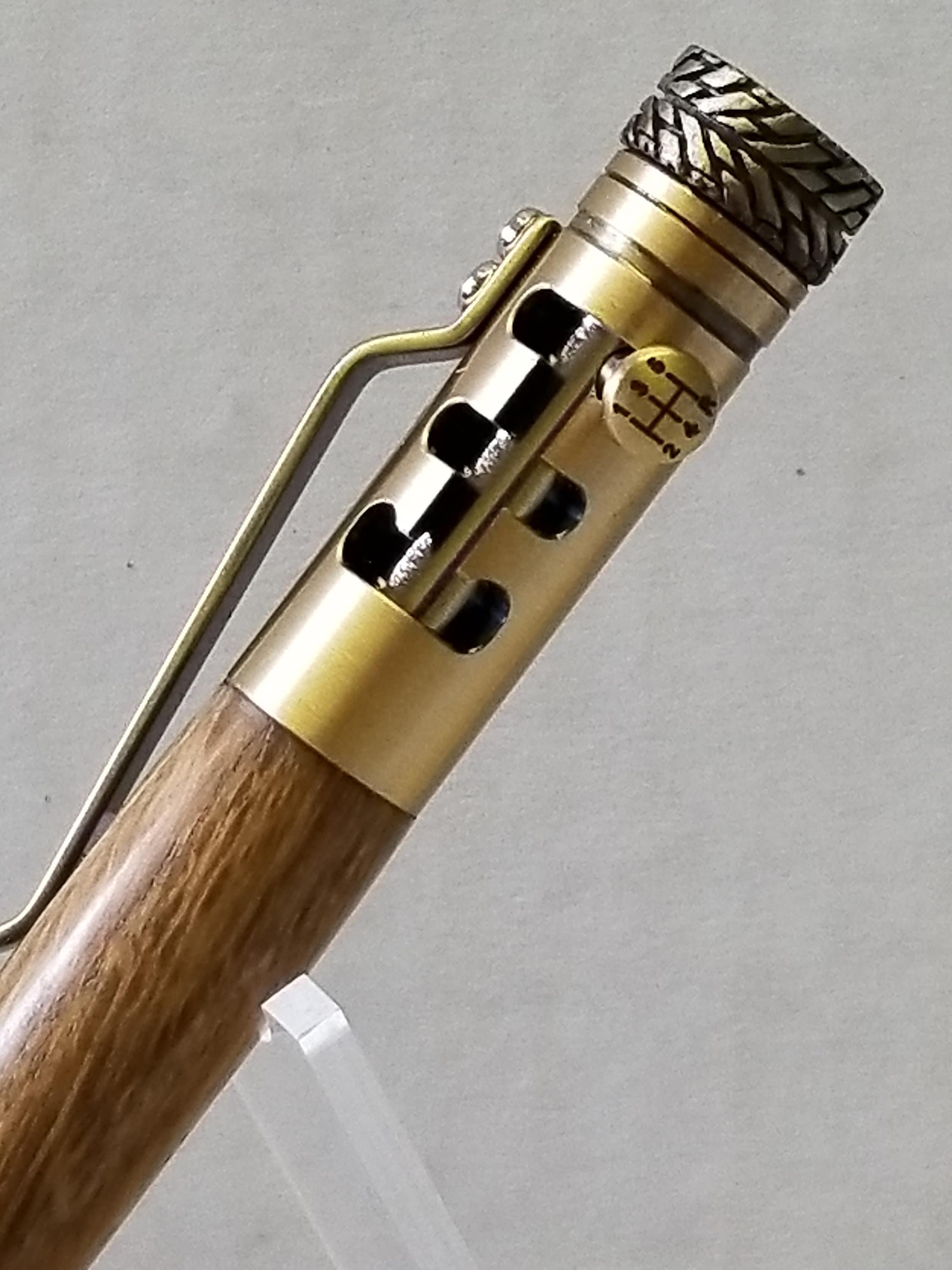 Gearshift Antique Brass pen is an ideal gift for any car enthusiast. The mechanism design is based off a five-speed H pattern shifter and can be shifted just like the real thing! The cap features a car tire with a true to life tread and hubcap. The tip features the same tire tread as the cap. The shifter handle includes an etched five-speed pattern.