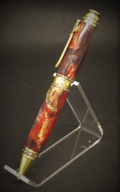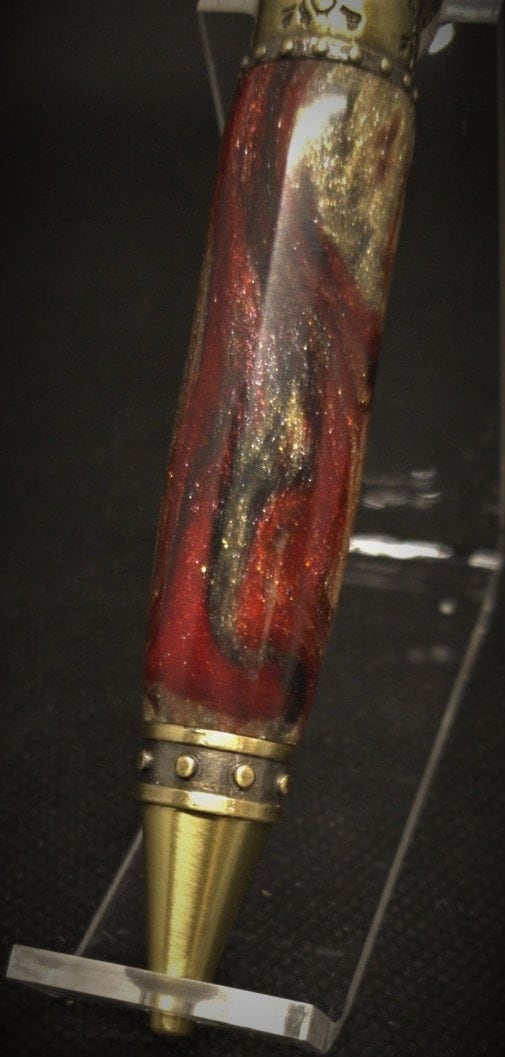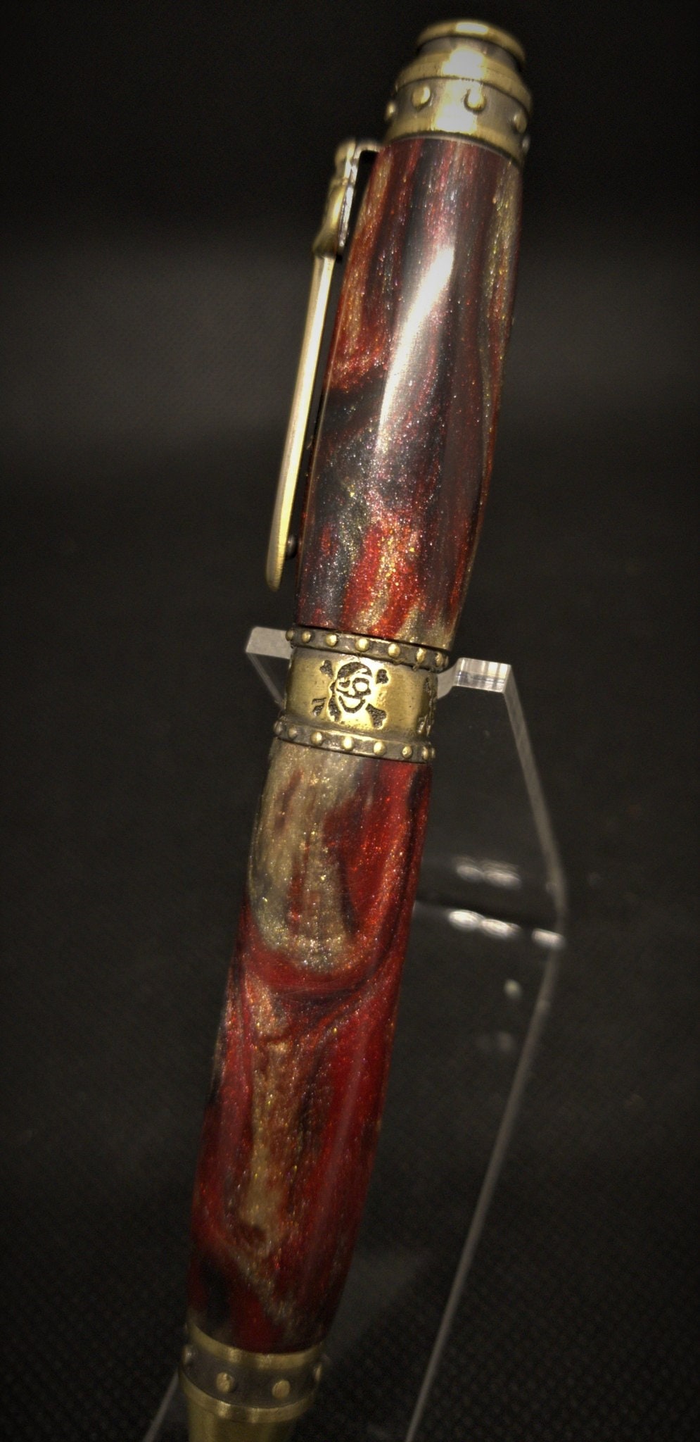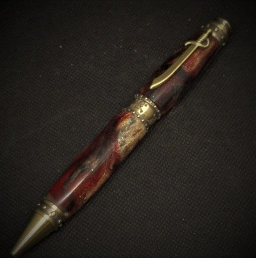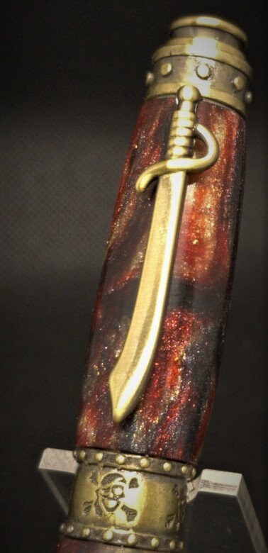 This is a great gift for any swashbuckler. Features a riveted band around the pen tip, center band and pen end. While the center band also features a laser etched skull and crossbones. The pirate theme is completed with a pirate sword pen clip. This pen includes a reliable twist mechanism and a smooth writing Parker style refill. The body of the pen is made from resin with real gem-quality diamonds that are ethically sourced.