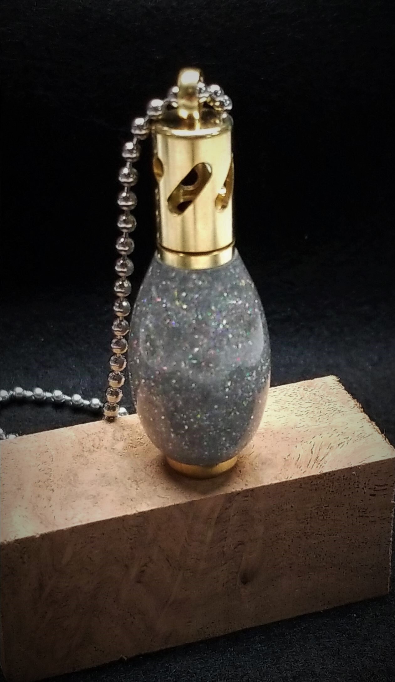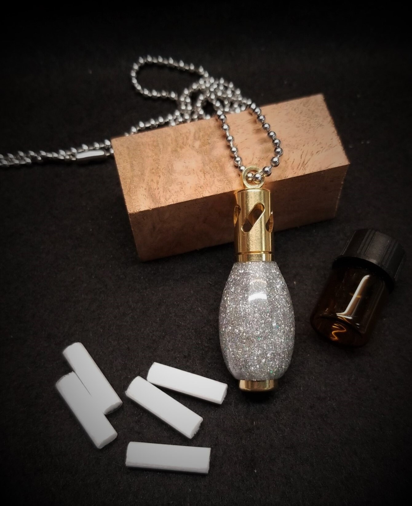Enjoy the benefits of aromatherapy everywhere you go. One of the hottest trends today, essential oils used in aromatherapy show positive effects on relaxation, mood, pain, anxiety and more. Just add a few drops of your favorite essential oil to the included cotton wick to absorb the oil, unscrew the top of the kit and add the wick inside. The simple, modern form is made of machined brass with machined holes to easily ventilate the aroma. Includes an adjustable 28in. chain, 5 wicks, an empty 2ml aromatherapy sample jar and a black gift pouch. Note; essential oils are not included but are widely available. The body of the aromatherapy necklace is made from resin with real gem-quality diamonds that are ethically sourced.